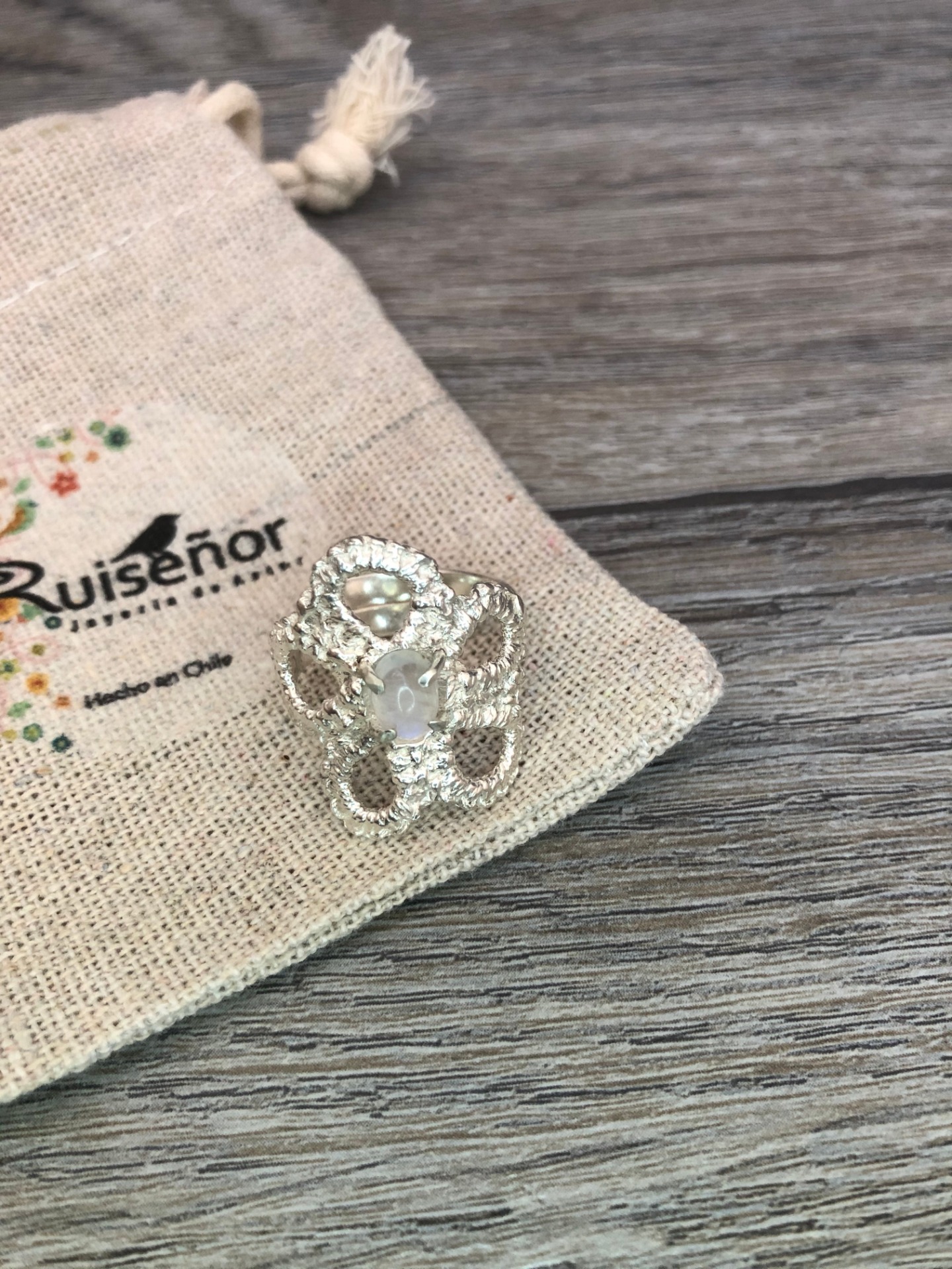 tejido técnica Frivolité y traspadado a plata engaste de piedra luna en el centro.