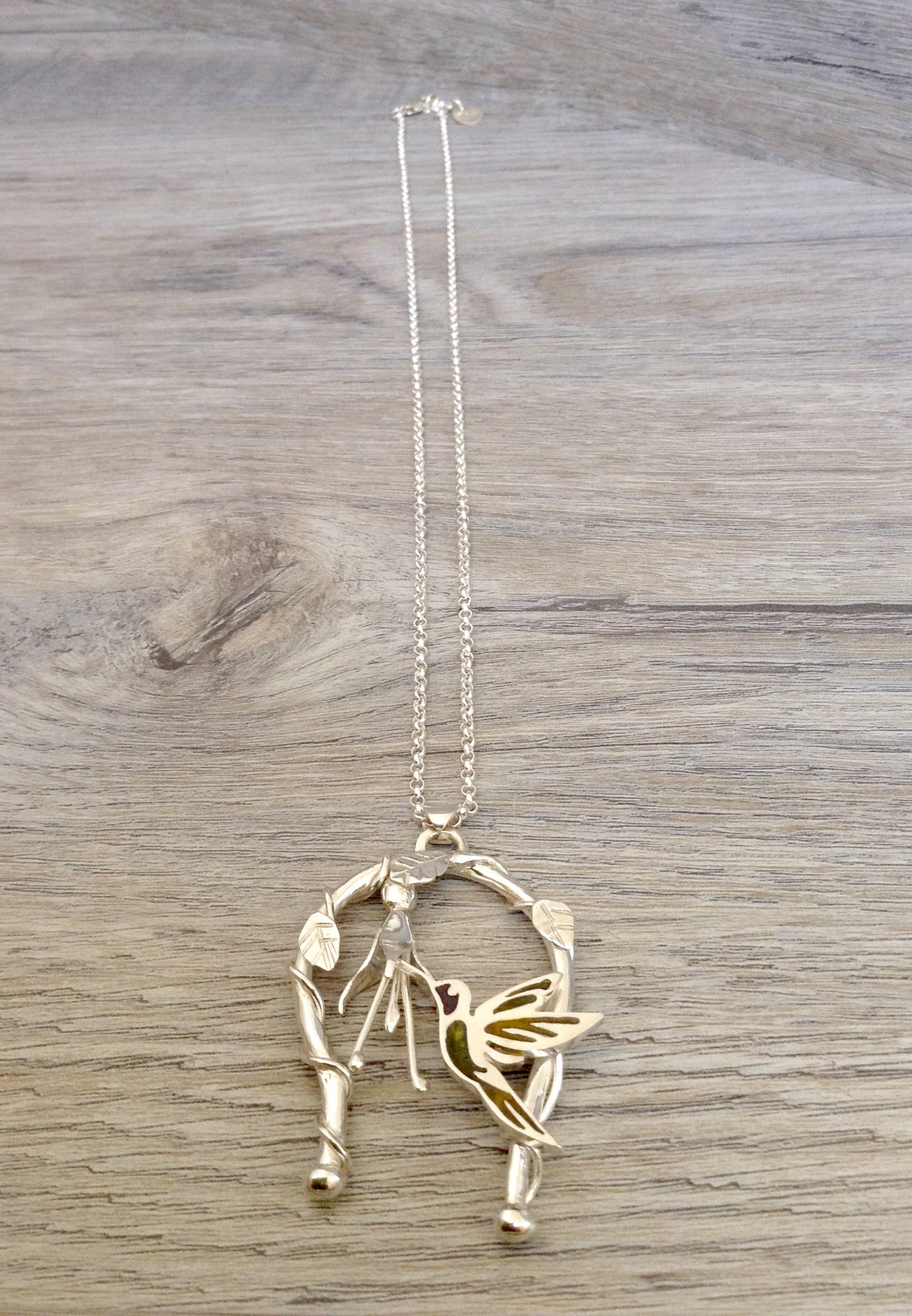 Colgante colibrí todo hecho a mano plata 950 con pajarito coloreado con resina