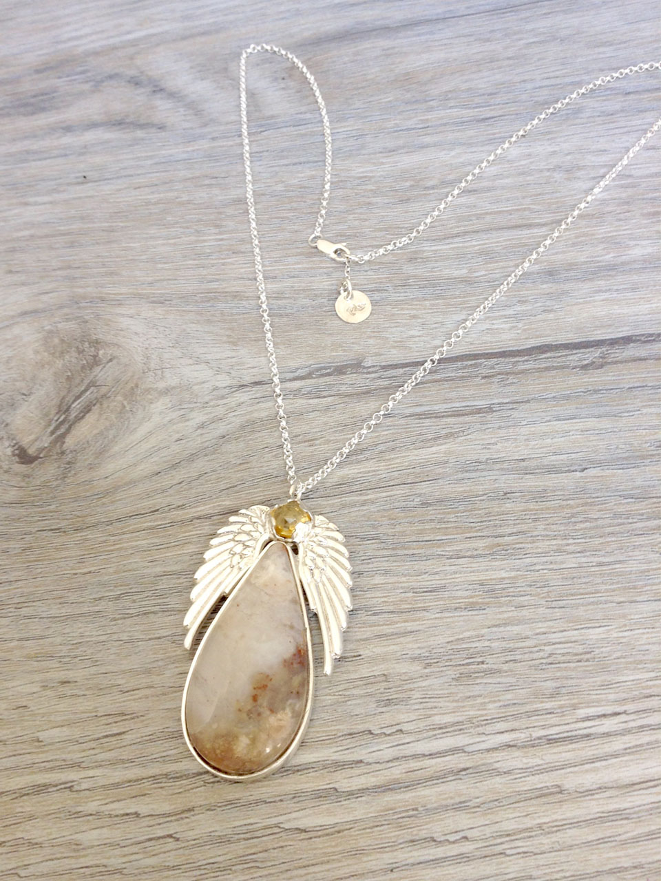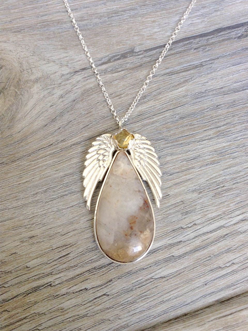 Collar diseño de ángel con piedra citrino propiedades atracción a la felicidad y prosperidad, ópalo peruano propiedad de potenciar la conciencia cósmica induce a la vision psíquica y mística.
