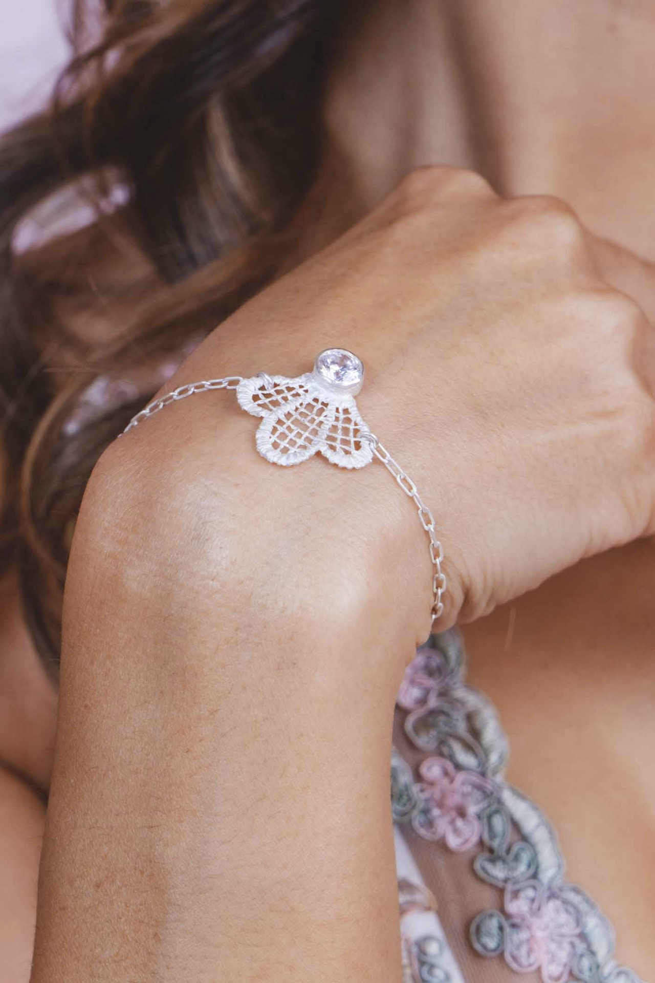 Pulsera delicada hecha totalmente en plata maciza con la técnica antiquísima en traspasar una pieza de bordado o bolillo tejido en una pieza única aplicando un circón de 5mm .